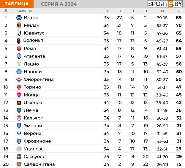 Обновлённая турнирная таблица Серии А