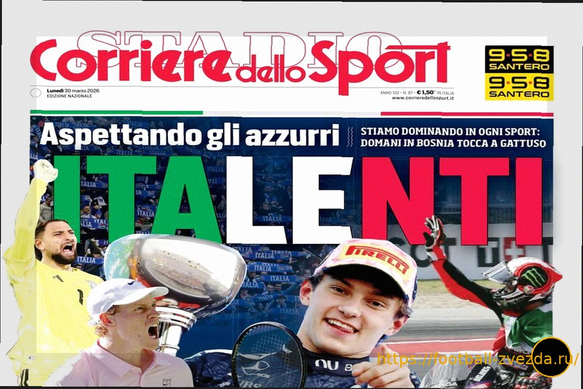 На первой полосе газеты CdS от 30 марта сообщается о впечатляющем доминировании в мире спорта. Главный заголовок подчеркивает всеобъемлющие успехи во многих дисциплинах, а также анонсирует, что завтра внимание спортивного сообщества будет приковано к Боснии, где свой «ход» предстоит сделать известному Дженнаро Гаттузо. Эта новость отражает уверенность в своих силах и ожидания от предстоящих спортивных событий.